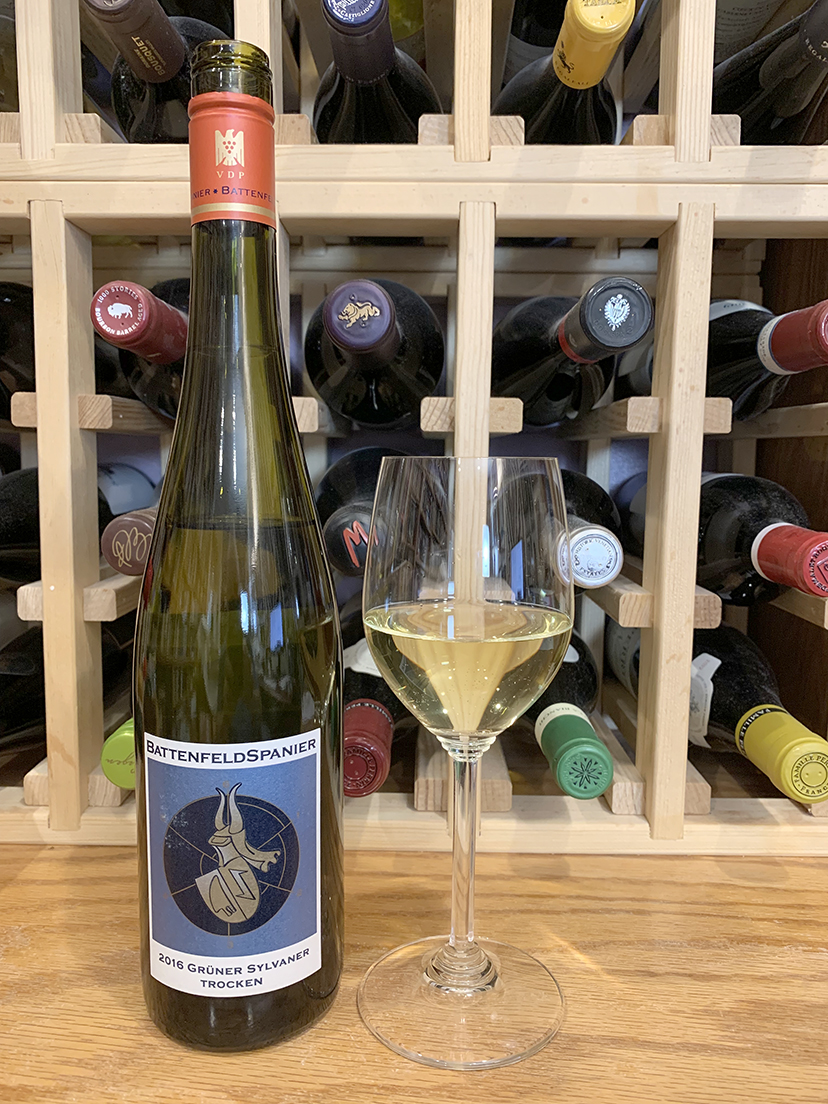 Trocken—dry in German wine nomenclature, but hint of sweetness because trocken has hint of sweetness and ripeness of fruit. Light-medium body. Rich in the mouth for a sylvaner (sylvaner and grüner sylvaner are same thing, with sylvaner the more common name for the grape variety). Biodynamically farmed grapes. No oak. Creamy and delicious with nice touch of minerality and particularly a soupçon of saline late in the finish. 12.5% ABV