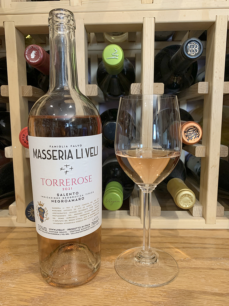 Masseria Li Veli Torrerose Negroamaro Rosato Salento IGT 2021 is tasty rosé that delivers some depth and complexity. Tastes similar to assertive Provence rosé. Lively, refreshing, elegant. Works as a “sip rosé all day” wine with enough going on to keep you interested. Pair with rich fish; fish risotto; sushi; shellfish; appetizers and snacks; works as an aperitif. Cheese—goat cheese; feta, halloumi, mozzarella, cheddar, baby swiss, burrata, humbolt fog. $16-20