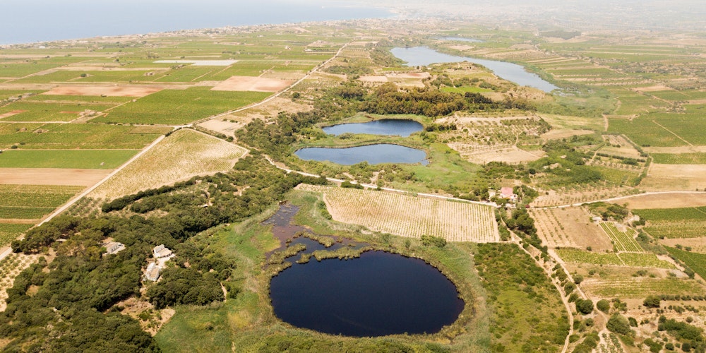 “Tenuta Gorghi Tondi” translates as “estate of round whirlpools” or “estate of round ponds.” It references three circular lakes on the estate. The lakes were formed by eroding limestone that created natural depressions that filled with fresh water. The lakes are protected by the WWF. The estate’s vineyards are integrated with the protected wetlands that are an important stopover for migratory birds flying between Europe and Africa.